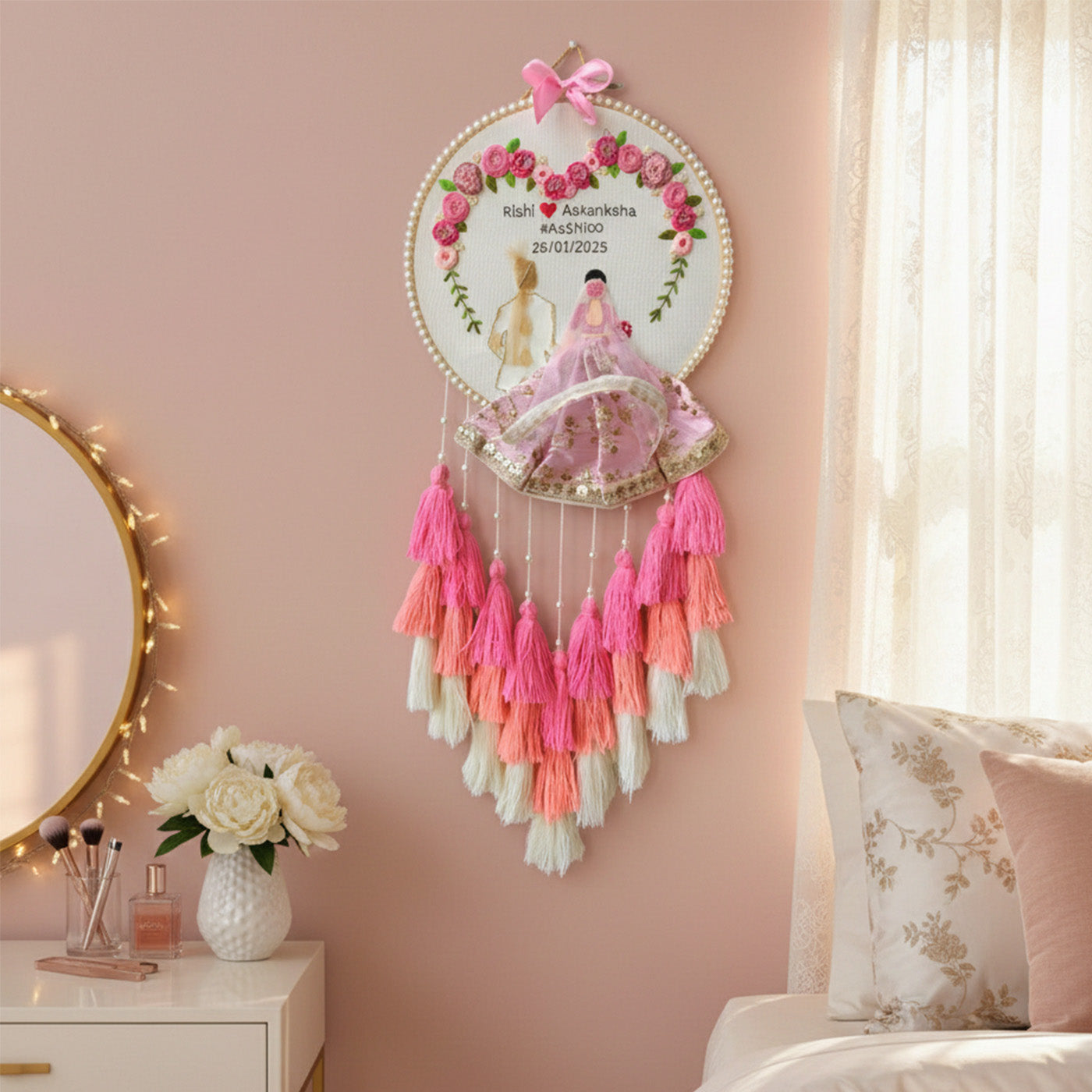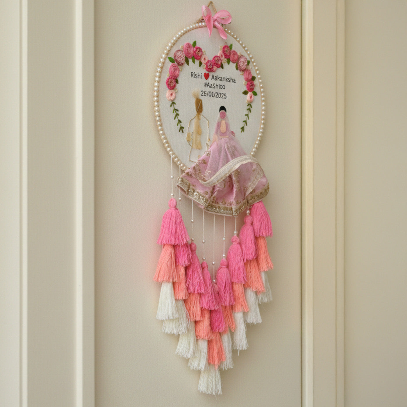 Personalized Embroidered Pastel Pink Wedding Plaque With Tassels