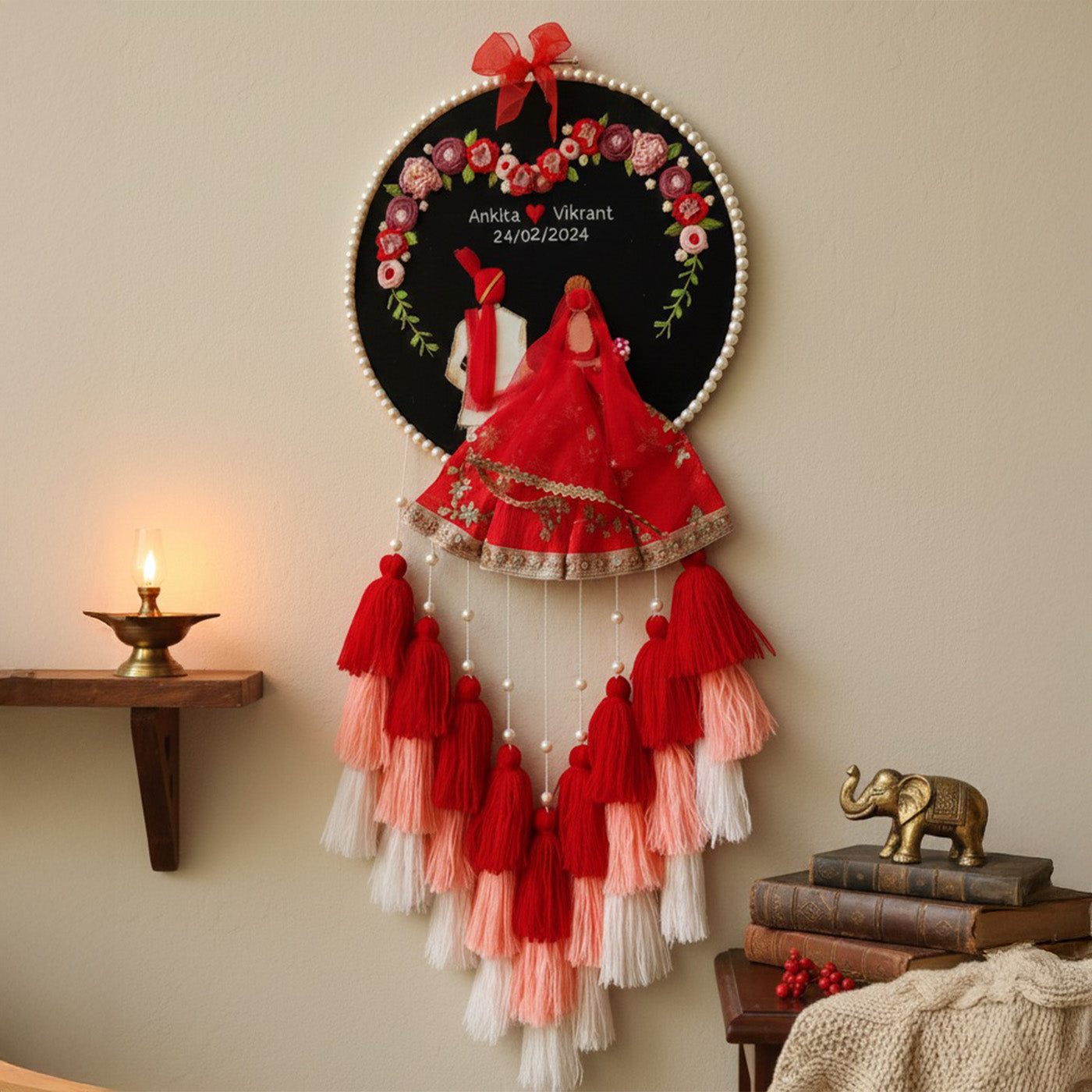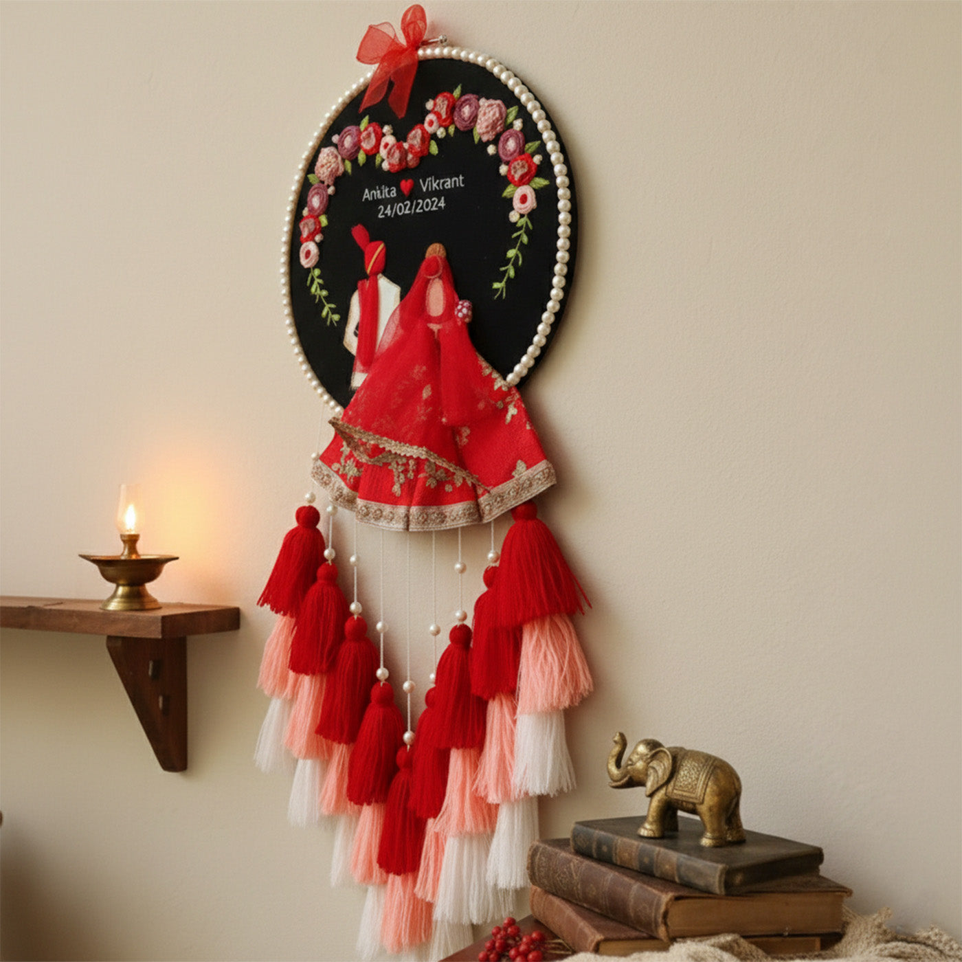 Personalized Embroidered Red & Black Wedding Plaque With Tassels
