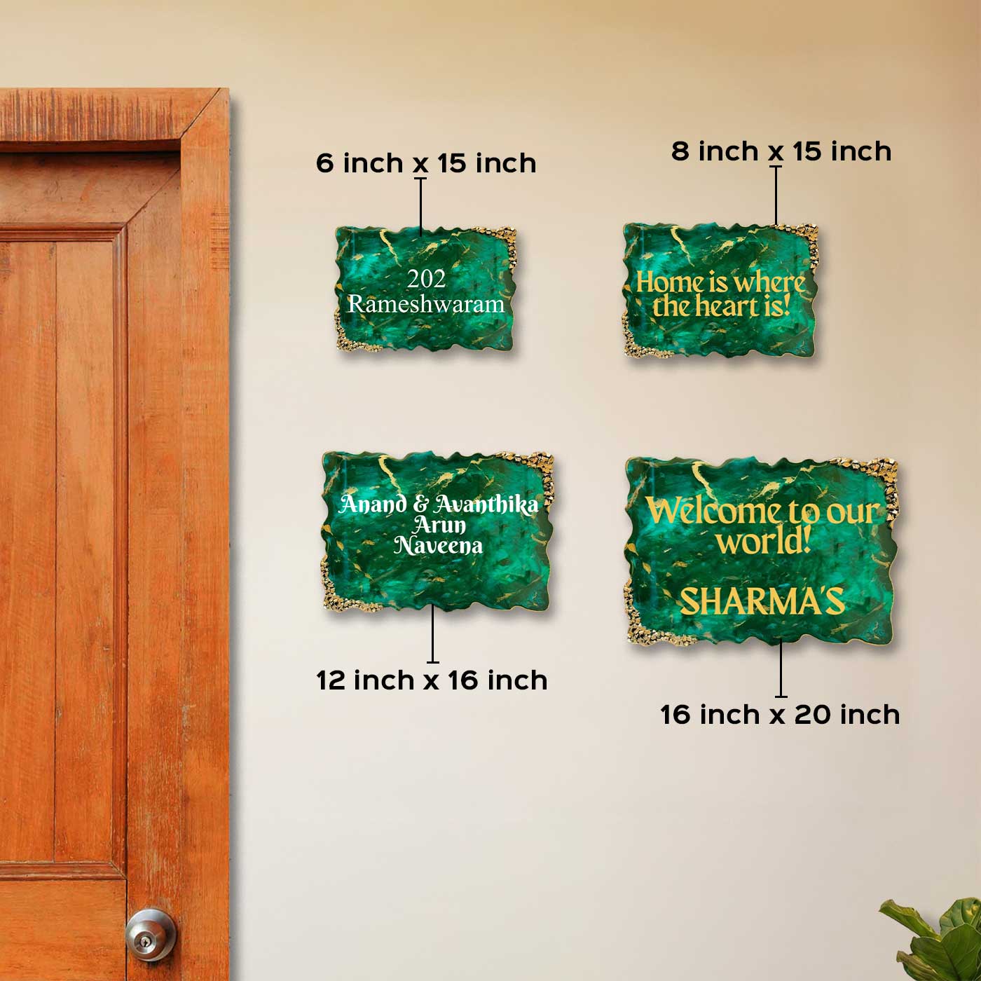 Emerald Green & Gold Personalized Marble Effect Wavy Rectangle Resin Name Plate | With 3D Acrylic Letters & Gold Stone Embellishment
