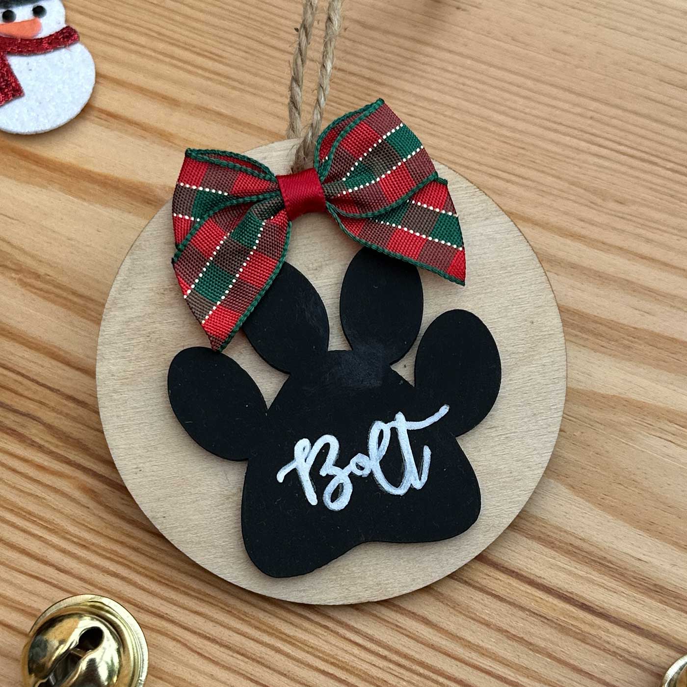 - Each MDF ornament is hand-painted with love, showcasing a cute paw print design and space for your pet’s name.