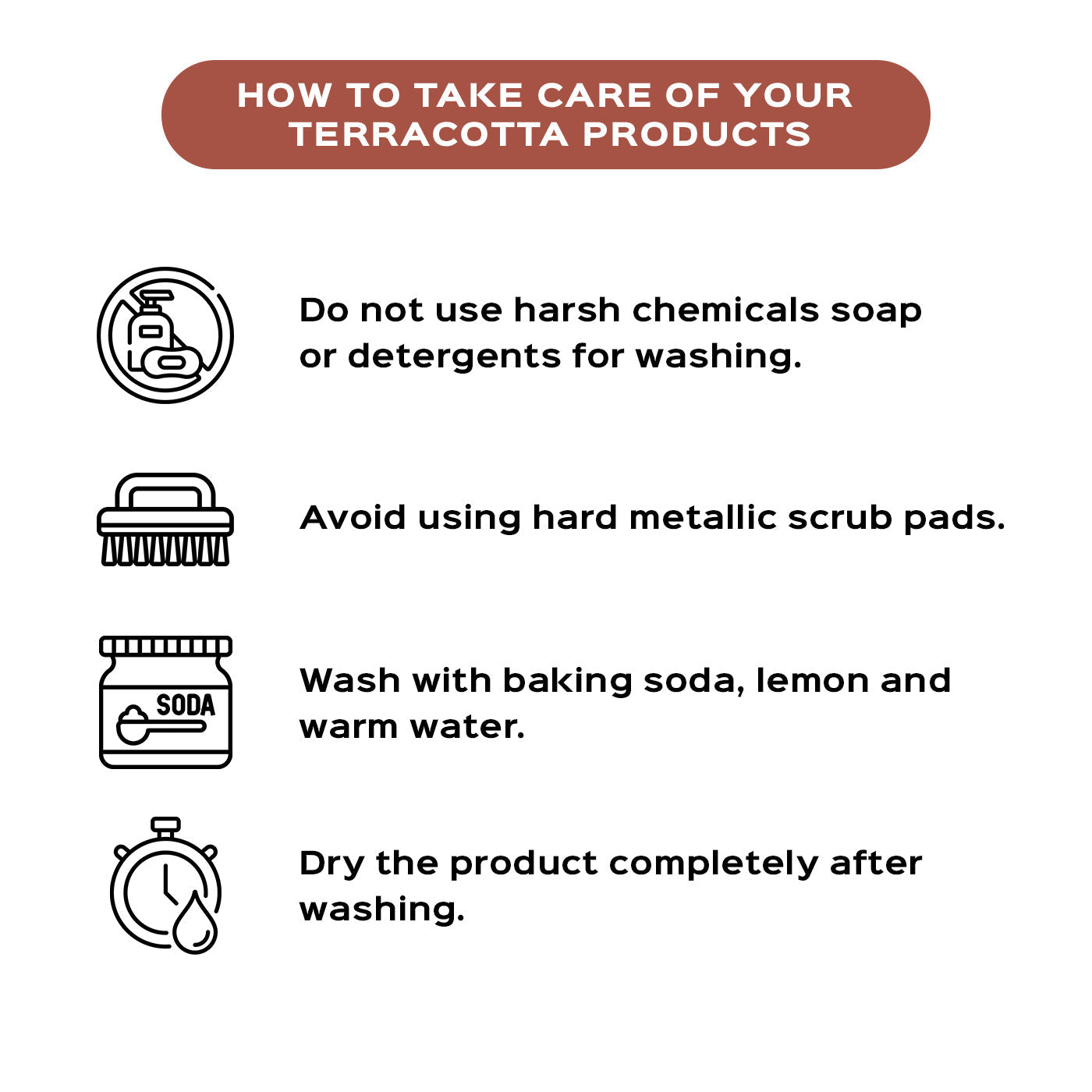 Handwash your terracotta pottery with warm water, baking soda, and lemon using a soft sponge or cloth. Do not use abrasive materials, such as steel wool or a scouring pad, as these can scratch the surface of the mug. Avoid using harsh detergents or chemical soaps. Rinse the mug thoroughly with clean water and allow it to air dry.