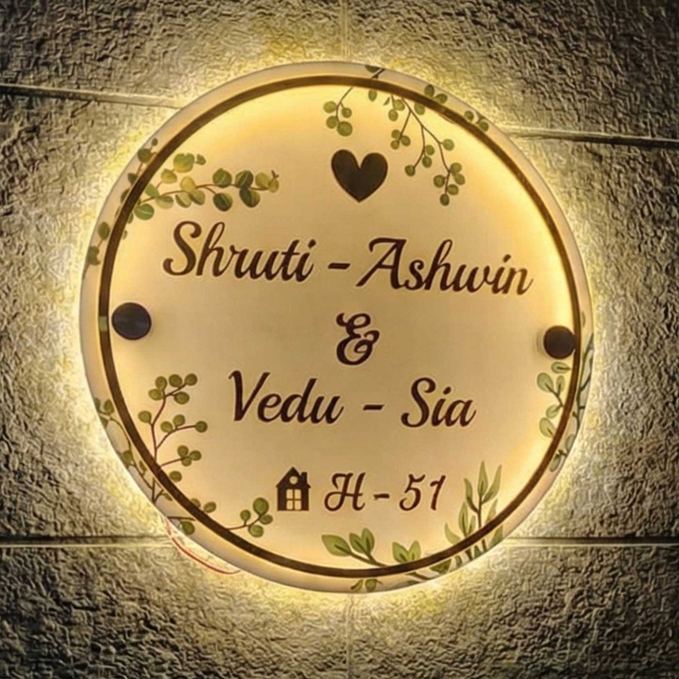 - Glow up your space with the Personalized Handmade Leaf Printed Circular Acrylic Name Plate!