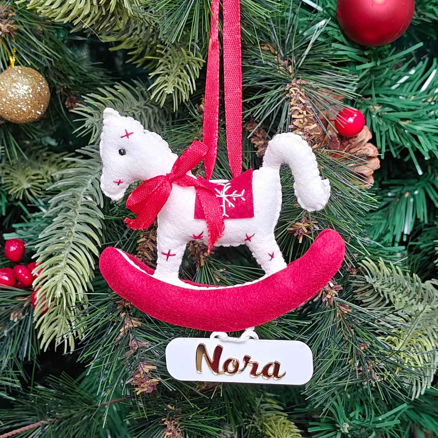 - Bring playful holiday charm to your tree with this snowy rocking horse ornament.