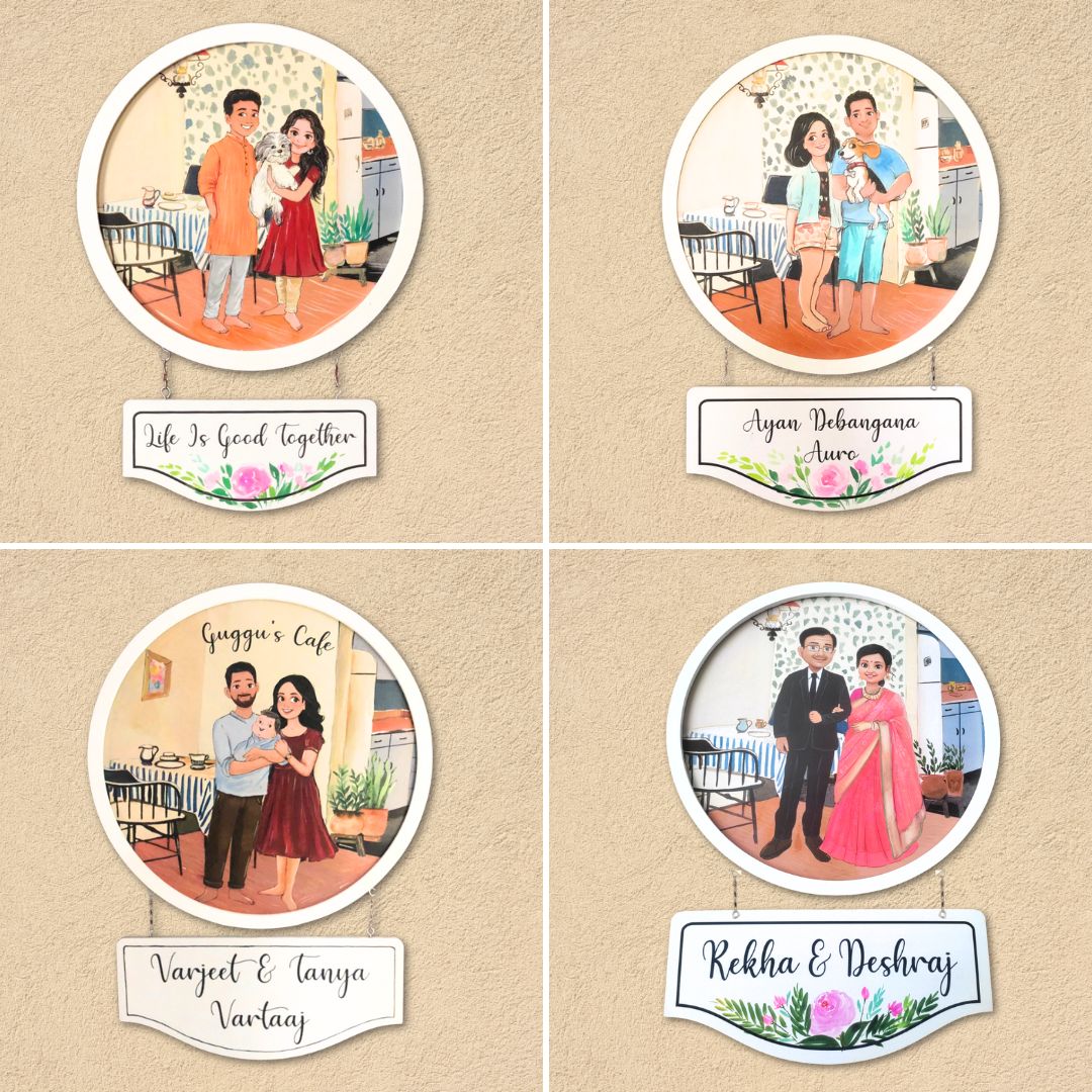 Here, the artist will create a personalized nameplate based on your preferences, without adding any individual member characteristics to the caricature. The members shown in the image will remain the same on the final name board.