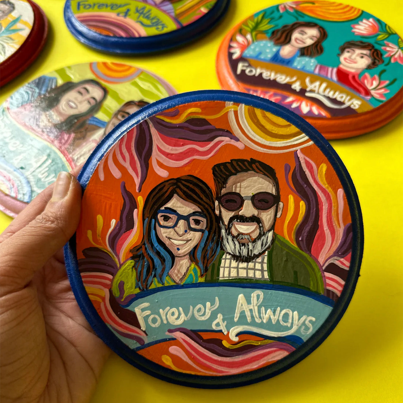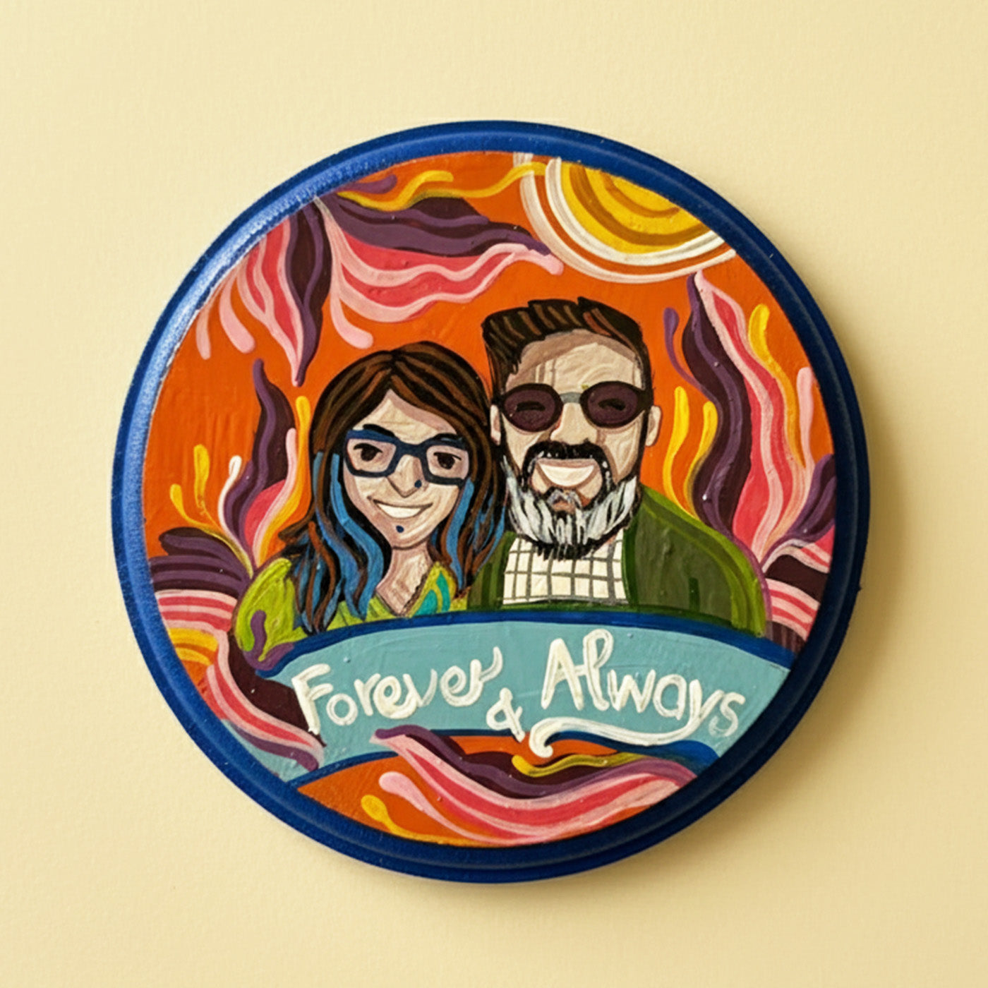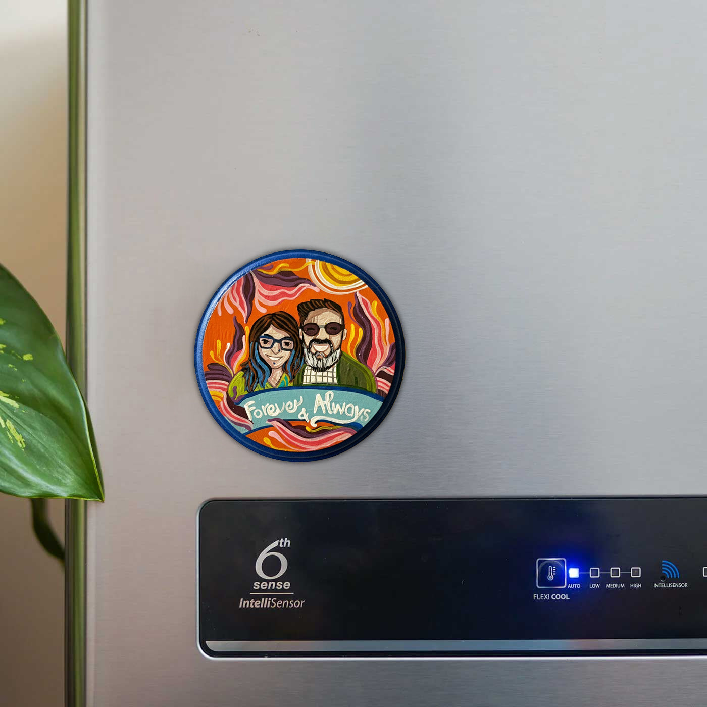 - Celebrate your favorite memory in bold, colorful style with this XL hand-painted caricature magnet.