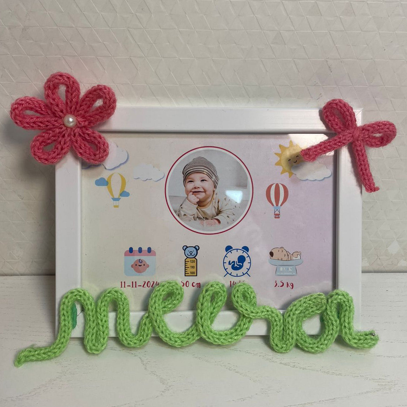 - This personalised photo frame features your baby’s name handcrafted in knitted wire.