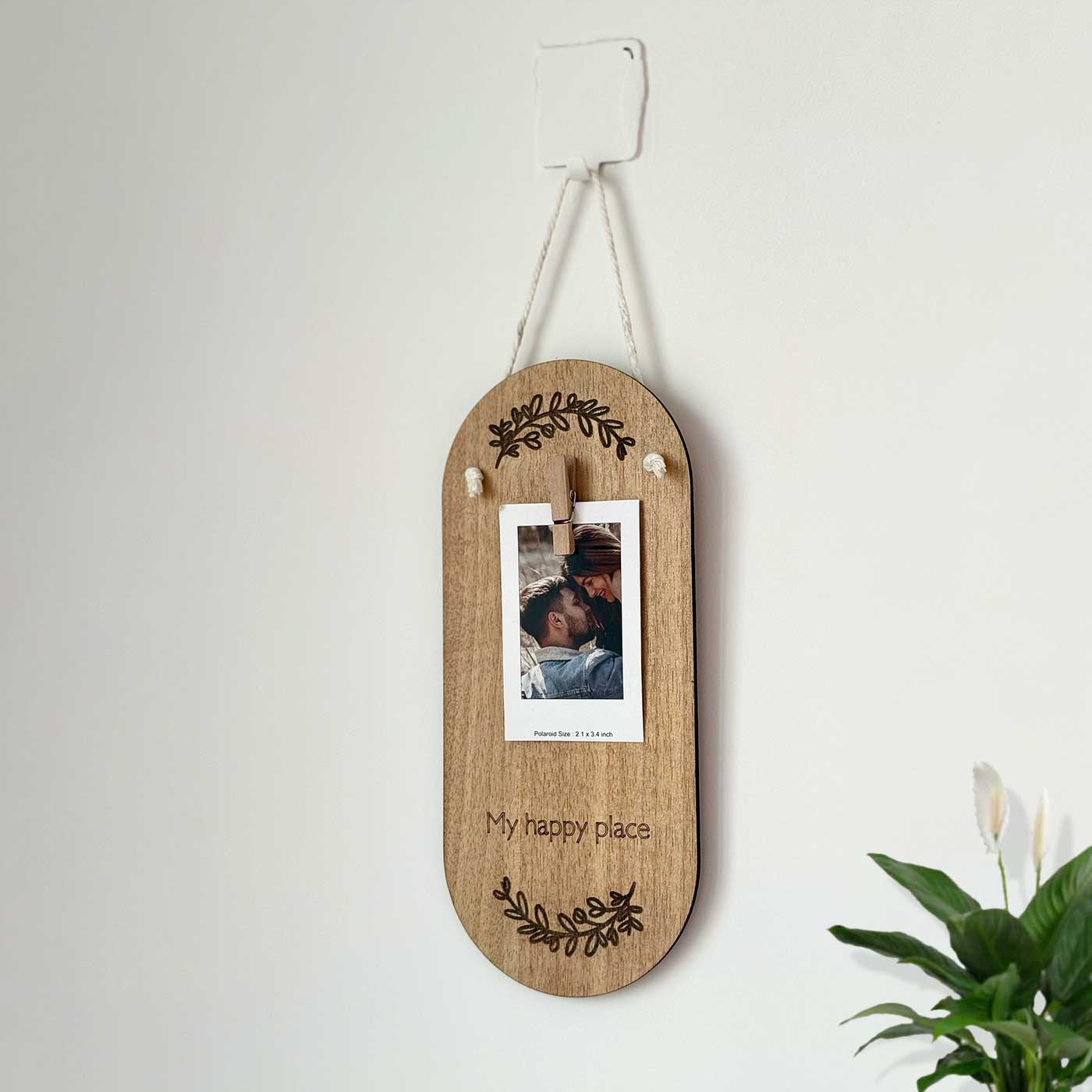 - A capsule-style wooden wall hanging designed to display a single photo with a meaningful message.