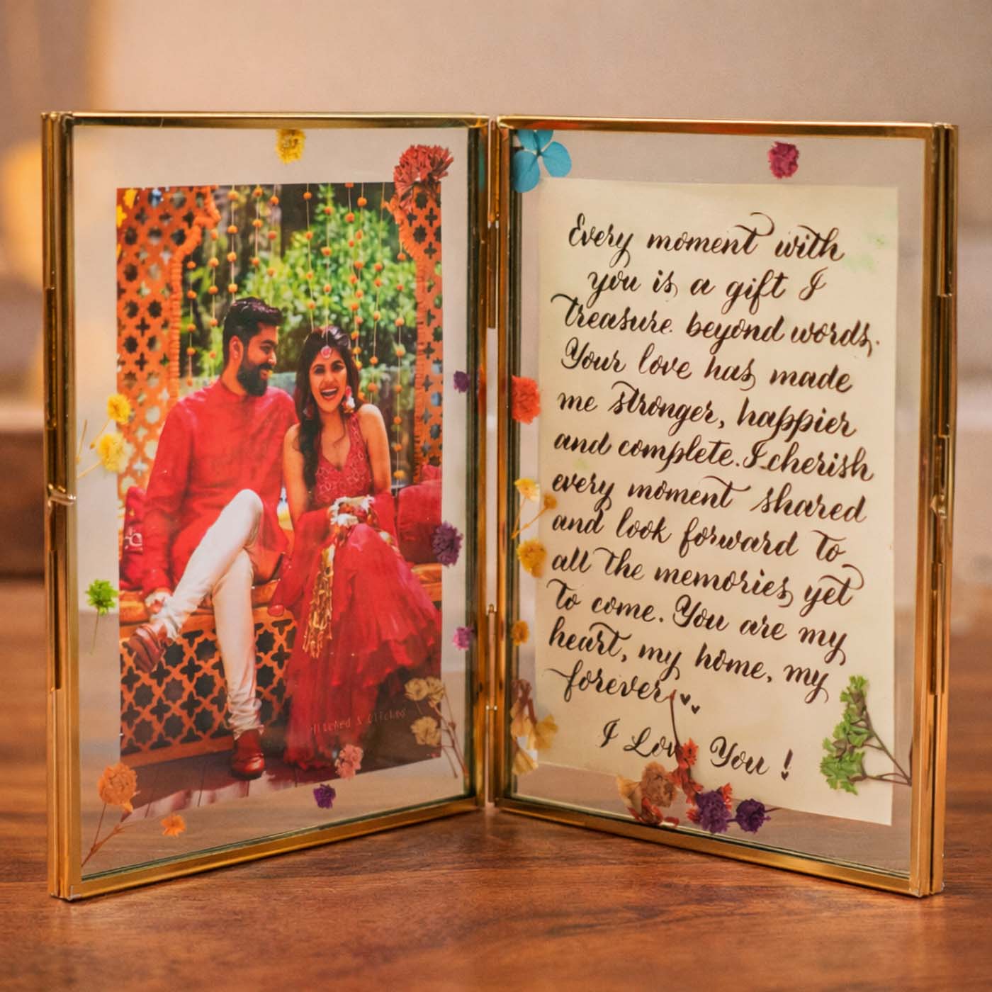- Crafted with attention to detail, the frame combines dry flowers, printed photograph, and elegant calligraphy to create a one-of-a-kind design.