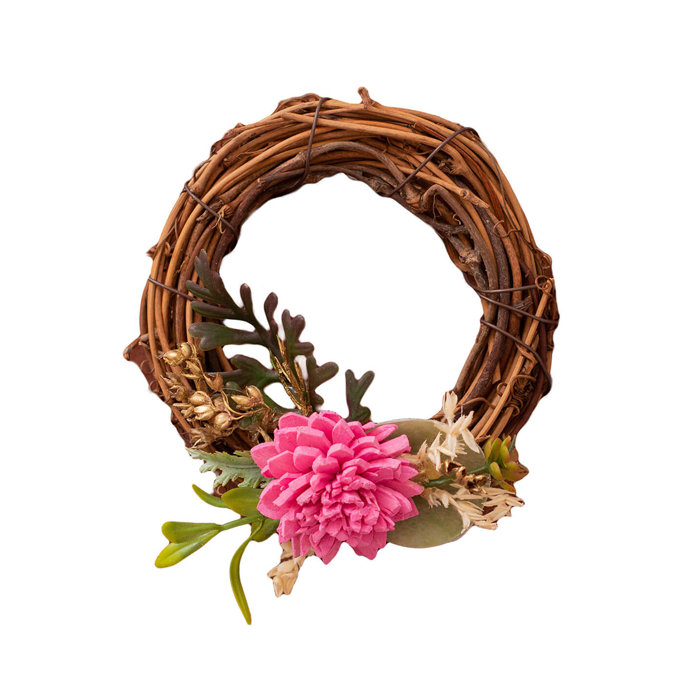 • This rustic wreath is made of grapevine and sola wood flowers, giving your home a natural, rustic and cosy look.