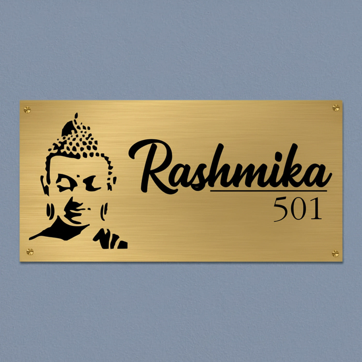 Buddha Engraved Personalized Golden Metal Name Plate | Rectangular, Outdoor, Weather Proof