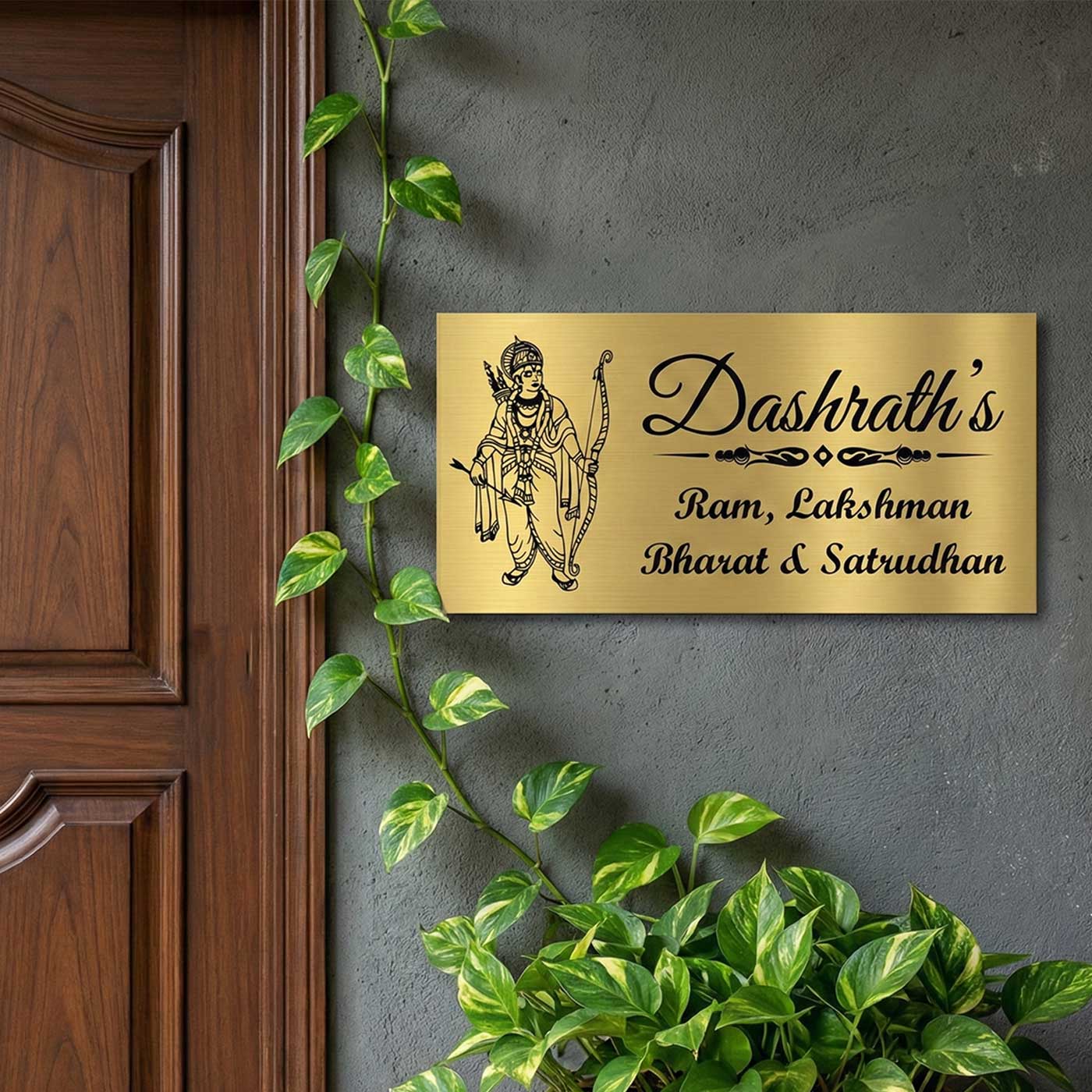 Lord Ram Engraved Personalized Golden Metal Name Plate | Rectangular, Outdoor, Weather Proof